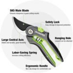 - Labor-Saving: These garden secateurs are designed with a spring, which can keep the blades automatically open after each cutting. It can save your strength and reduce the fatigue of your arm and hand. Also easy to use for long periods of time